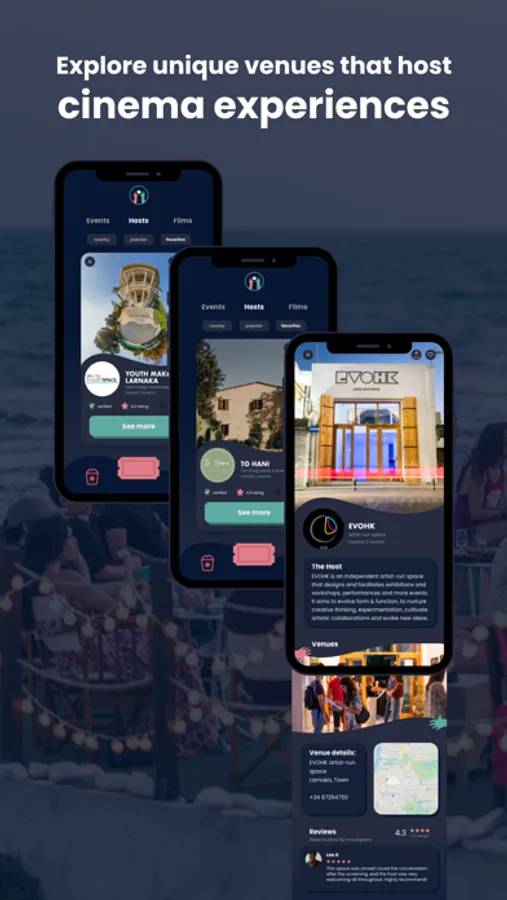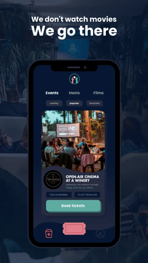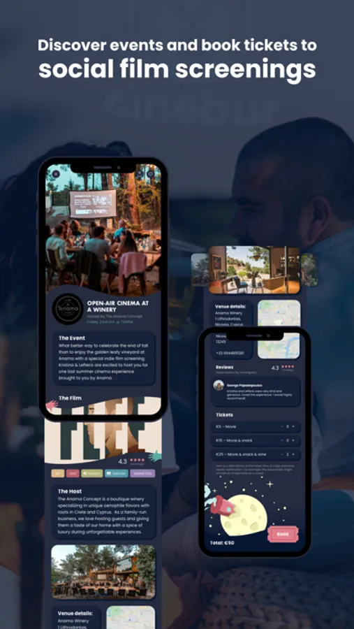Every event on Cinebur is organized by a member of our passionate community of Host partners, offering a near-infinite variety of screenings, themes, venues, and creative visions. Cinebur moviegoers attend events in wineries, artistic spaces, museums, cafés, rooftop bars, boutique hotels, community spaces, and many more diverse venues.