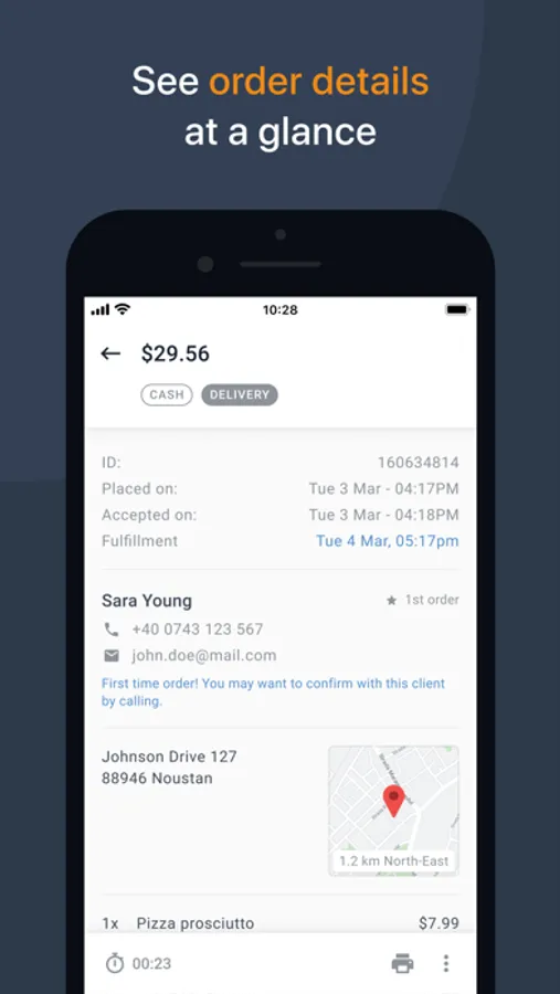Tap on the order and you can see all its details, from client’s contact information to payment method, ordered items and special instructions.