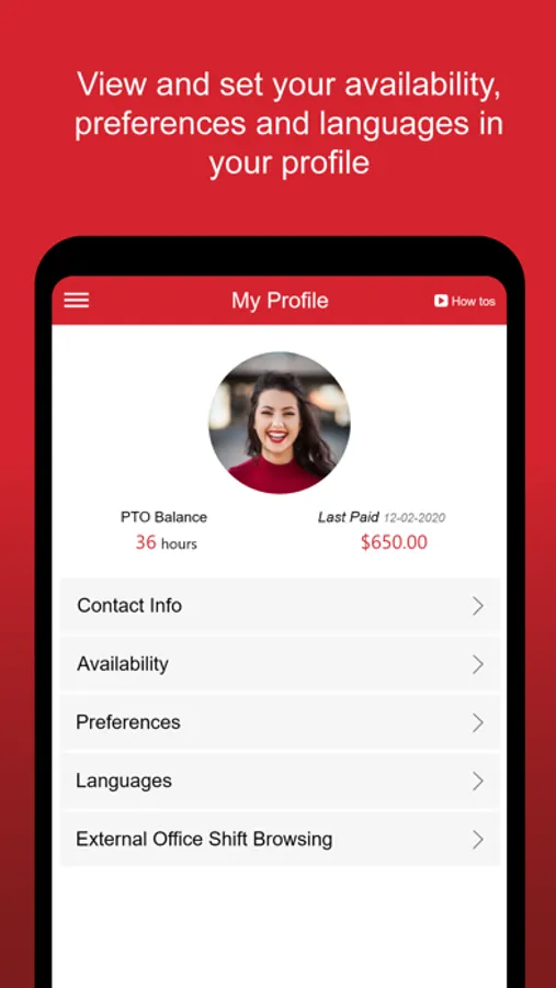Get a more personal experience from My Profile. Check your PTO and last paid amount. Set your work preferences and get better open shift results.