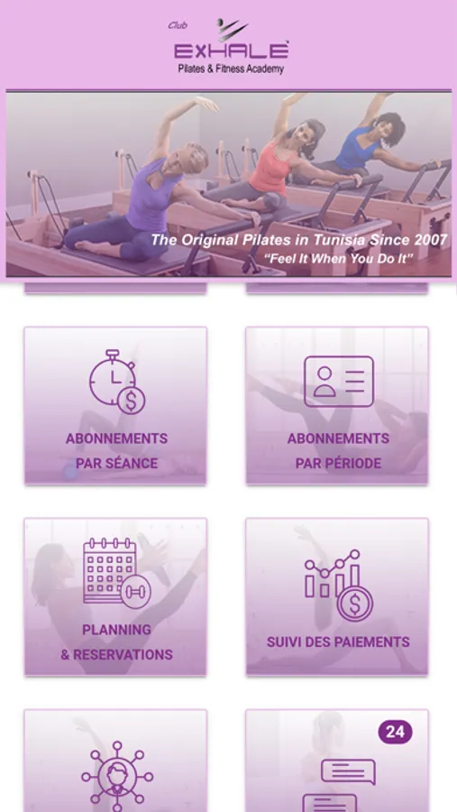 Notre application « CLUB Exhale » a été développée spécialement pour donner l’accès à vos adhérents d’avoir leurs propres espaces qui lui permet d’accéder aux différentes fonctionnalités de l’application: