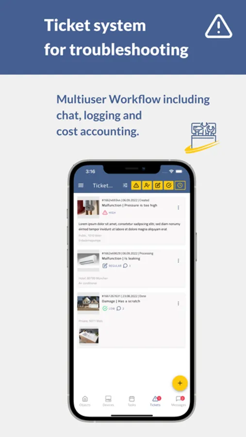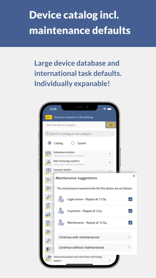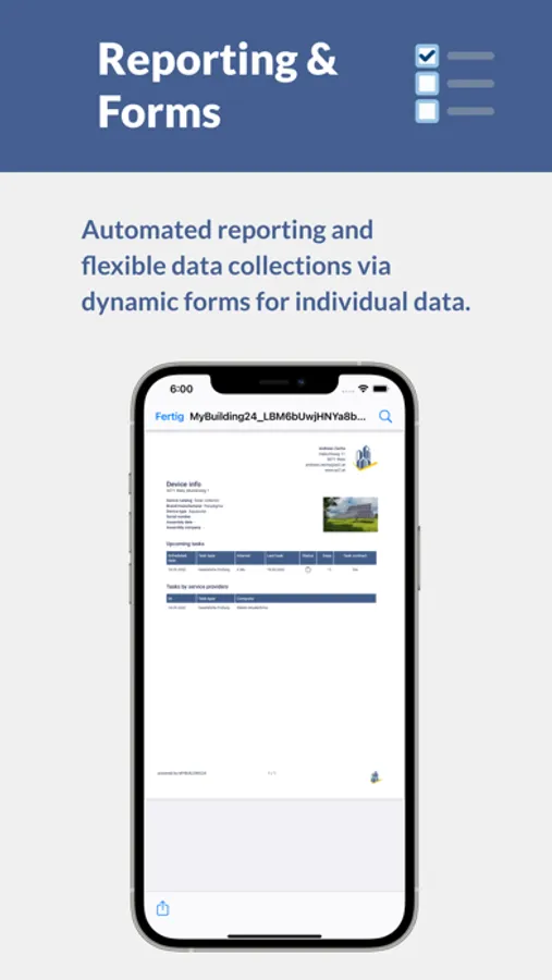 Track your devices requiring regular maintenance conveniently, utilizing 21st century technology. Apply QR codes or NFC markers to your devices and keep track of your inventory. Enter the respective maintenance dates and let MyBuiding24 remind you just in time! This is not only convenient but makes for a calm mind. Especially when it comes to documentation and warranty claims regarding insurances and maintenance duties required by law!