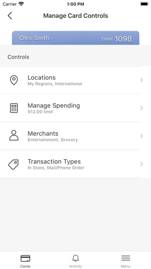 Set spending limits to decline transactions above your thresholds. Monitor activity by category such as gas stations and restaurants, and by type: in-store purchases, e-commerce transactions and ATM transactions.