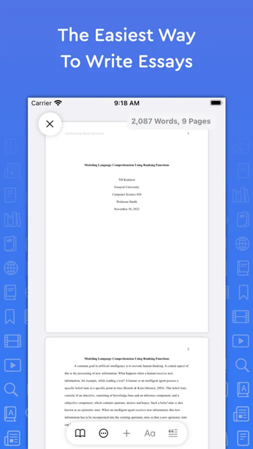 Essayist allows you to write APA, MLA, Chicago & Harvard Style essays with ease. From in-text citations and footnotes to references and page setup, Essayist takes care of everything. It greatly simplifies the academic writing process.