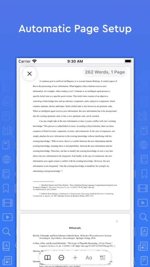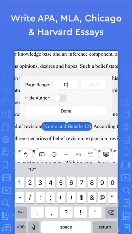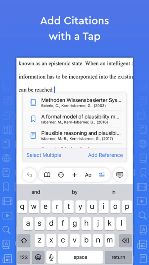 Add in-text citations and footnotes/endnotes with ease. Simply tap the insert citation button and select the reference you wish to cite. An in-text citation/footnote/endnote is automatically created for you