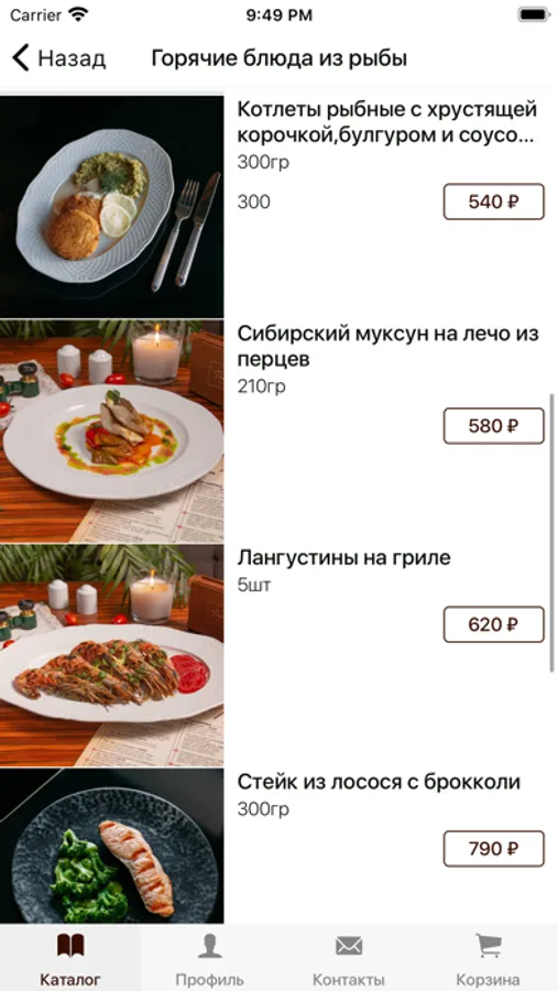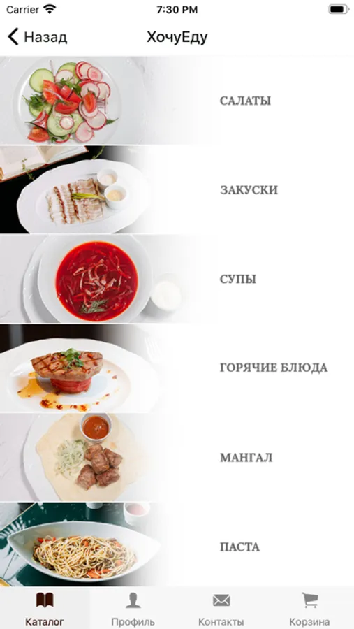 В разделе "ХочуЕду" вы можете найти порционные салаты (от 65 ₽), закуски (от 90 ₽), горячие блюда из рыбы и мяса (от 130 ₽), блюда на мангале (от 95 ₽), пасты (от 120 ₽), десерты (от 60 ₽) и напитки, а также блюда для большой компании в категории "Застолье".