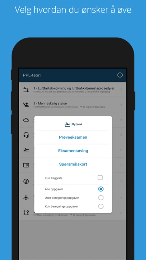 Merk at spørsmålene er laget av andre PPL-elever, basert på pensum. Oppgavene kan avvike (i noen tilfeller i stor grad) fra spørsmålene du vil se på eksamen. Dette er kun et hjelpeverktøy, du er selv ansvarlig for å møte godt forberedt til eksamen.