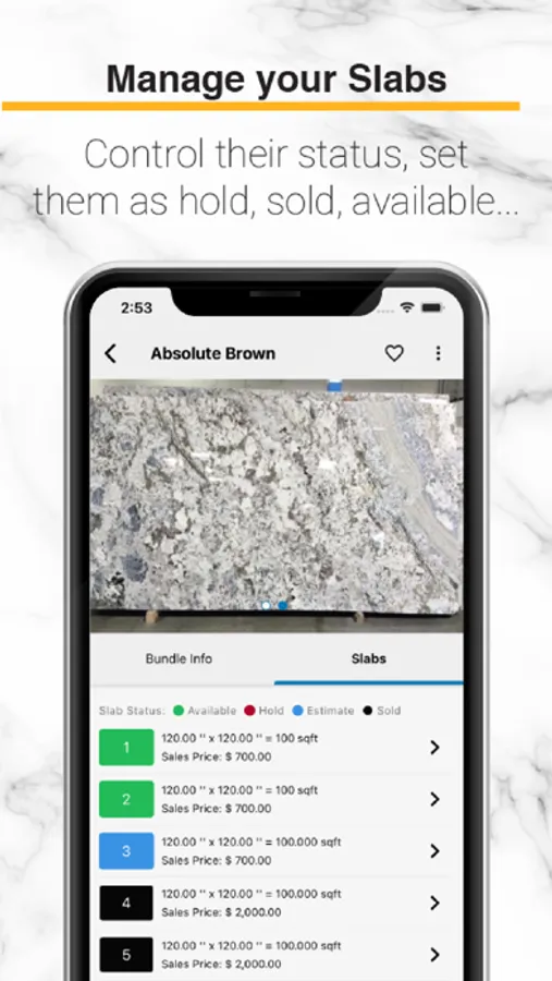 Start by registering your bundles and slabs with their pictures and details. Then you will have a live inventory which you can use to present your slabs to customers and to easily manage their details, status and important information. Once your slabs are set up, you will be able to print their QR Code labels and to tag them individually, unlocking new possibilities.