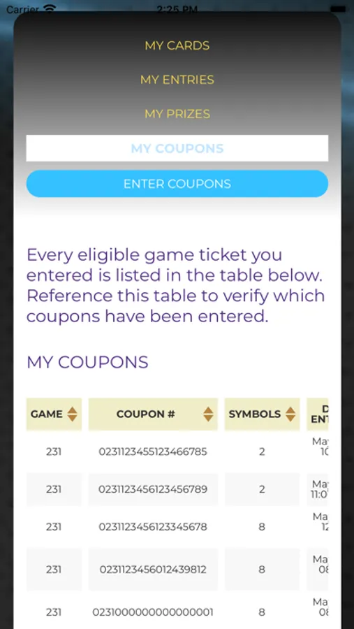 Scan as many coupons as you like in order to collect multiple entries. Entries are good up to the designated entry deadline. For a complete listing of the rules, click on the Rules link in the app.