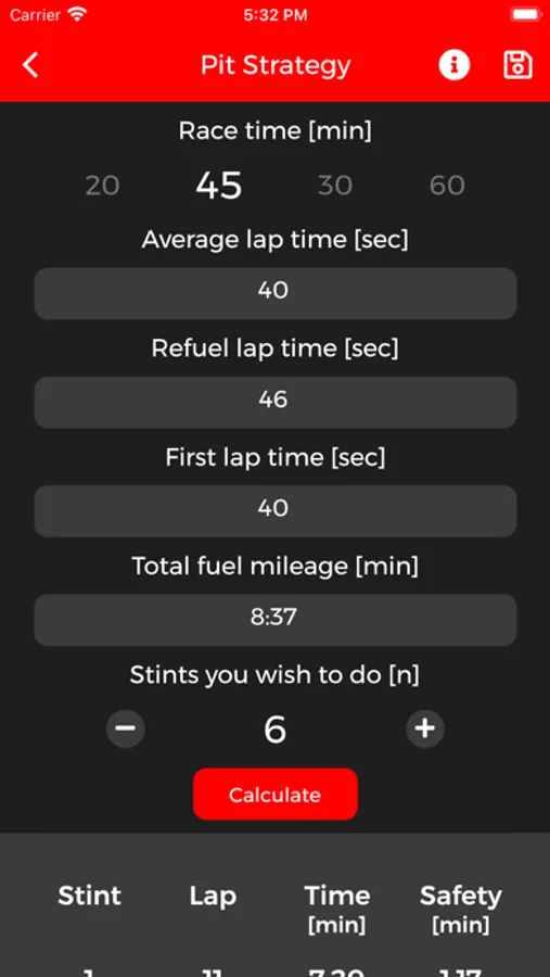 Thanks to the stopwatch in the app you can keep track of all your runs and you can also calculate the best lap and average time. The average time can be used to calculate the strategy.