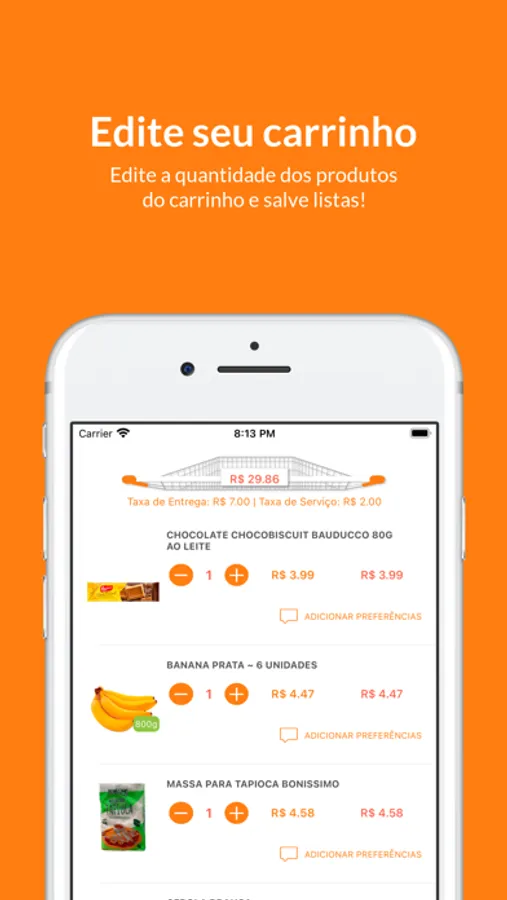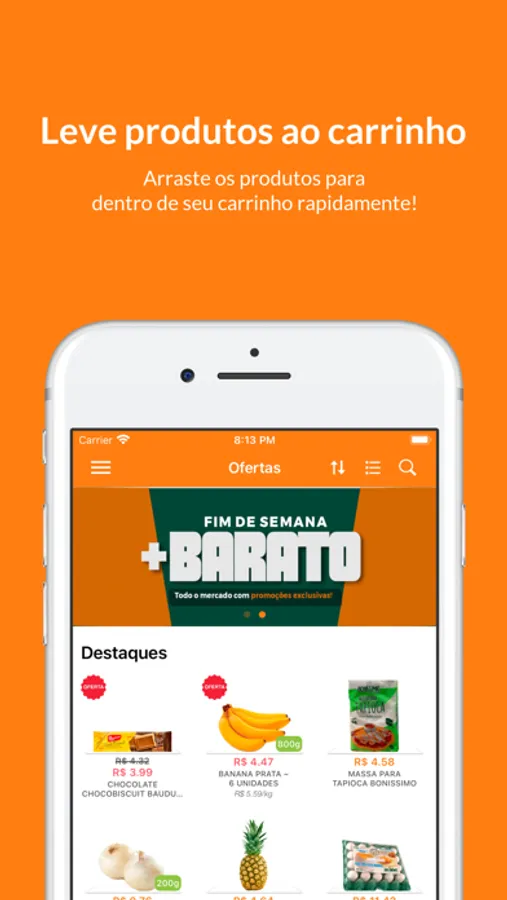 • Adicionar produtos no seu carrinho com um simples tocar e arrastar.