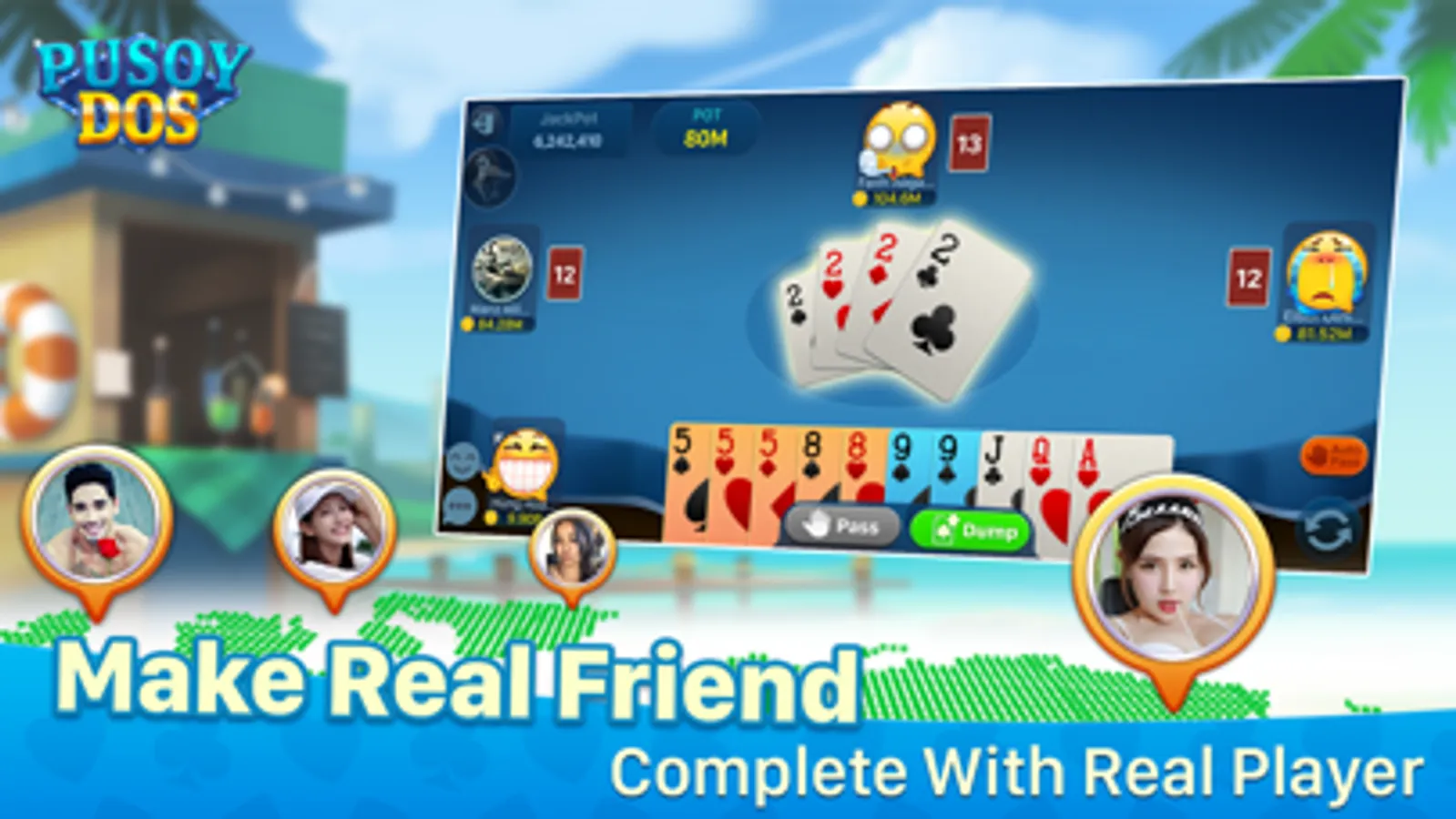 Pusoy Dos (or Filipino poker, also big two) is a popular type of shedding card games in the Philippines. The user needs to discard all the cards on by playing them on the table to become the winner.