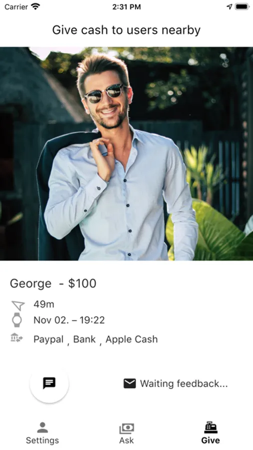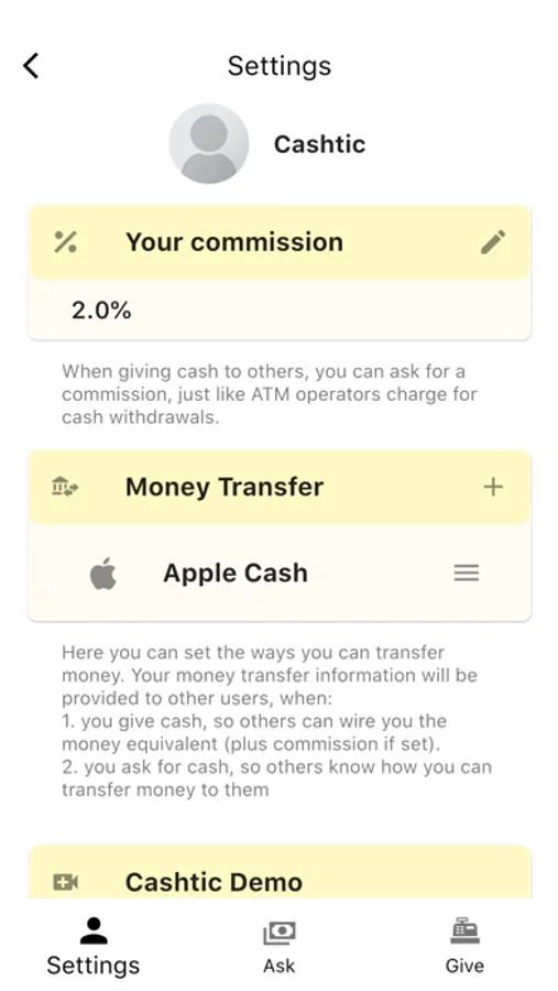 Do you need cash? Is the nearest ATM too far? Try Cashtic! Ask nearby users for cash, and once you meet and get it transfer the equivalent amount via your own money transfer app. You can specify in the app how you will settle the cash you receive, eg: bank, Paypal, Zelle, Revolut, Bitcoin, Google Pay, PayTM, Wise, or Apple Pay. Please note Cashtic does not transfer money at the moment. Arrange meetings in front of police or guarded areas for increased safety.