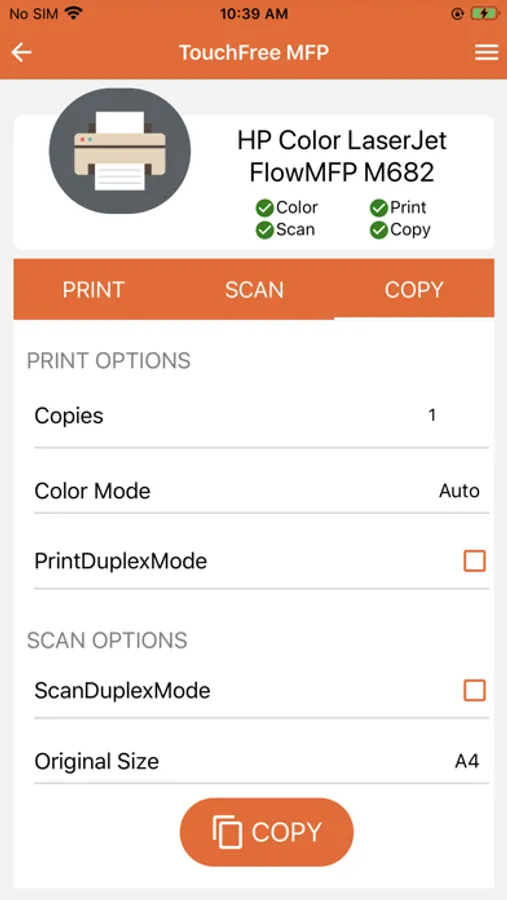 TouchFree MFP allows you to use your phone to set key options to print, scan, copy, and share documents on select HP devices.