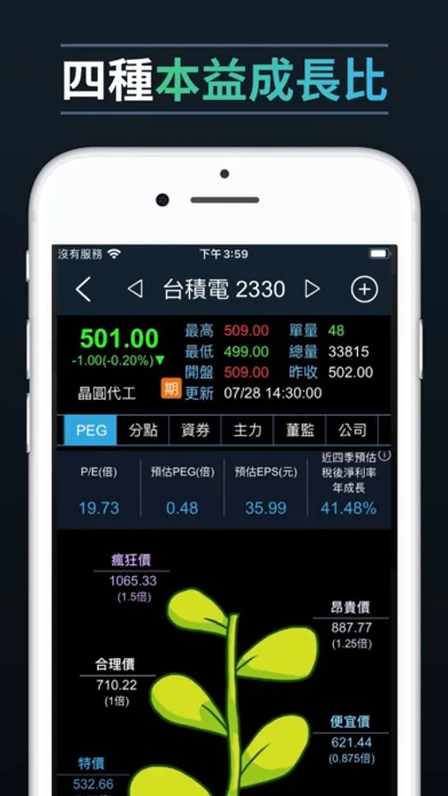 提供「本益比」、「淨值比」視覺化河流圖功能,快速找到「合理」又「安全」的標的