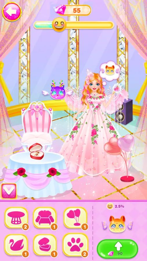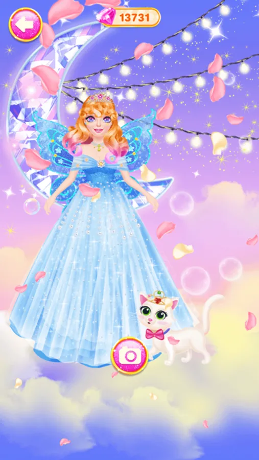 The princess needs breathtaking jewelry and dresses! Choose the most shnining crown, necklace and earrings to set off the princess's beautiful eyes! In her dressing room, there are hundreds of splendid magic sticks & wings, dresses and shoes! Take pictures of the princess & her favorite pets in the royal palace!