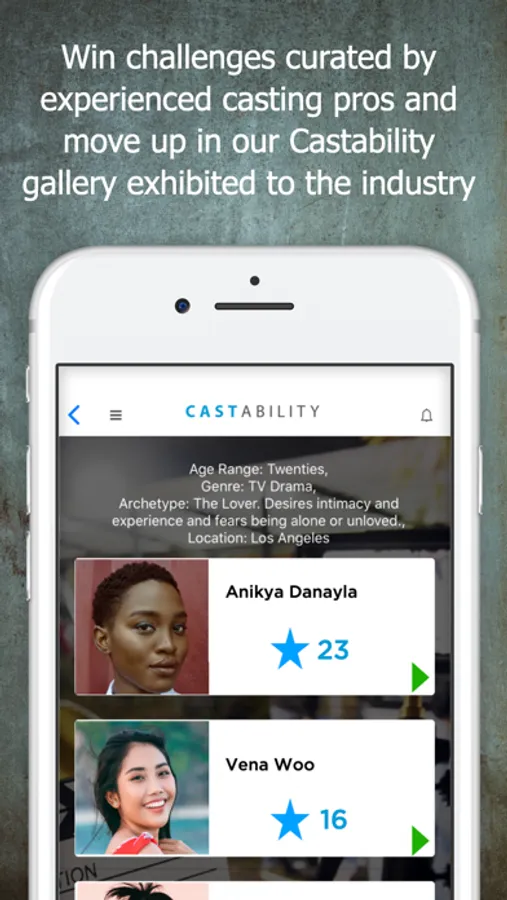 The submission chosen as most castable moves on to the next round where their scene stands against other actors chosen as most castable for the same scene. These rounds continue until one last scene is left standing. Actors receive a star for each round in which they’re chosen, moving up the rankings of the Castability gallery with each additional star. The last actor standing gets a free credit to shoot their next scene.