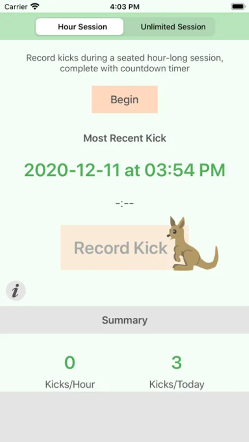 Record all your kicks in one, easy-to-use app! Record in a hour-long session complete with a handy countdown timer, or select the unlimited session to record for as long or as short as you like!
