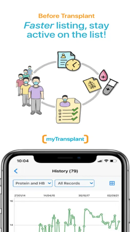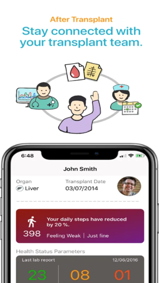 It supports all solid organs, kidney, liver, pancreas, heart and lungs. myTransplant is your care companion that will guide you from pre transplant assessment to listing, it will help you remain active on the waiting list and then will be your lifelong care companion post your transplant. myTansplant app captures and analyzes patient data, highlights shifts in the trends trends and tracks patient's progress at all times.