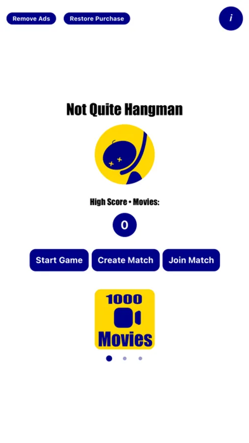 Not Quite Hangman is a word game a bit like Hangman. It combines crossword clues with a hangman like interface. The game contains three packs of 1000 questions: Movies, Albums and Books. Each question is a title that must be guessed by revealing letter tiles one by one.