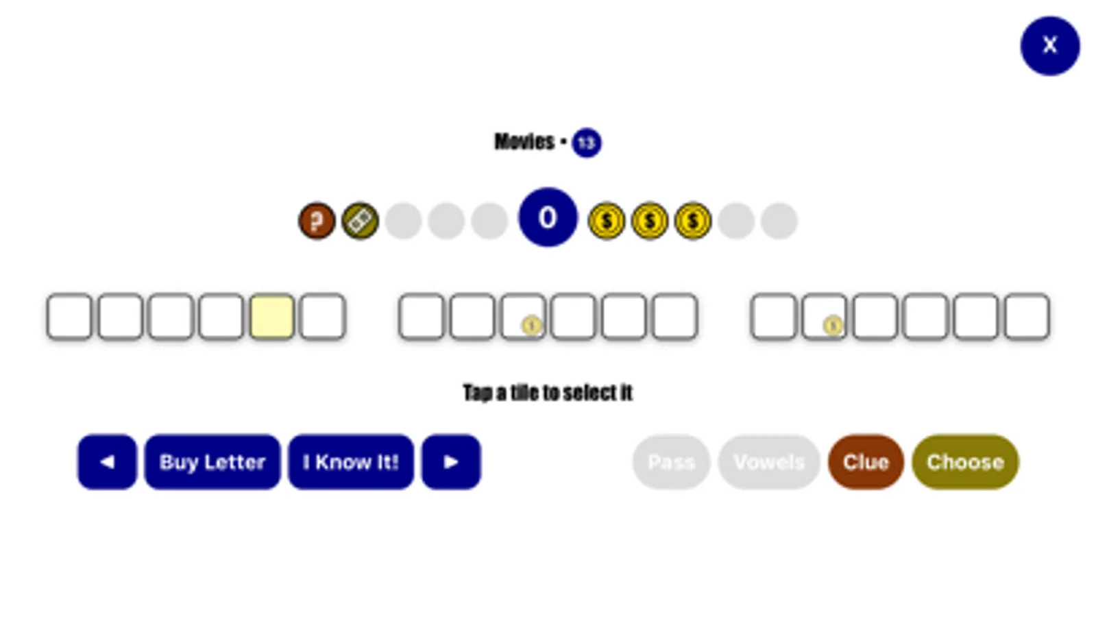 The aim of the single player game is to score as many points as possible before using up all your coins and lifelines. Wrong letter guesses cost one coin. Once you think you know the phrase you can click the “I know it” button to score points, but after that one wrong guess means Game Over.