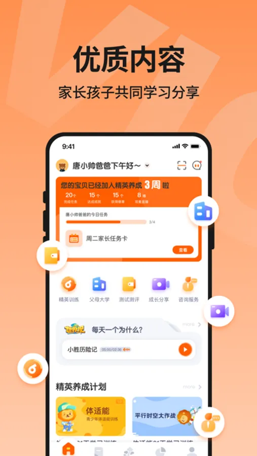 【精英训练体系】我们自主研发的超爱学精英训练营,体适能,超级演说家等训练体系,帮助孩子全方位提高学习能力,自理能力,交流能力,体质健康,完美切合少儿素质教育。