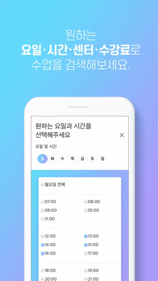 원하는 요일/시간/센터/수강료로 수업을 검색해 보세요.