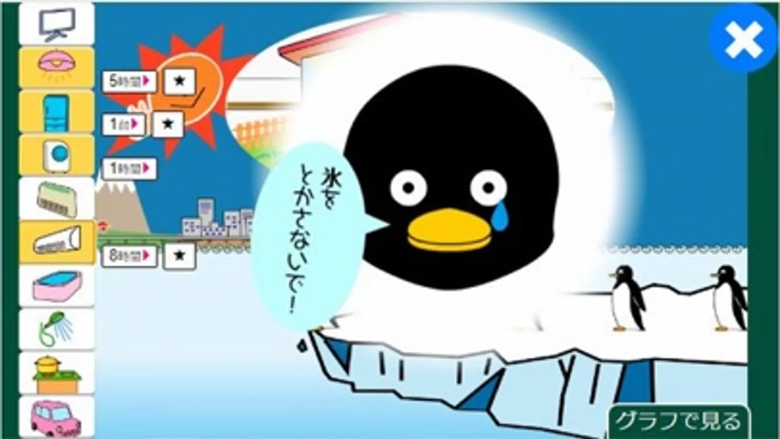 「ペンギンを救え」では家の家電製品等の使い方で、どう温暖化を食い止められるのかを学べます。