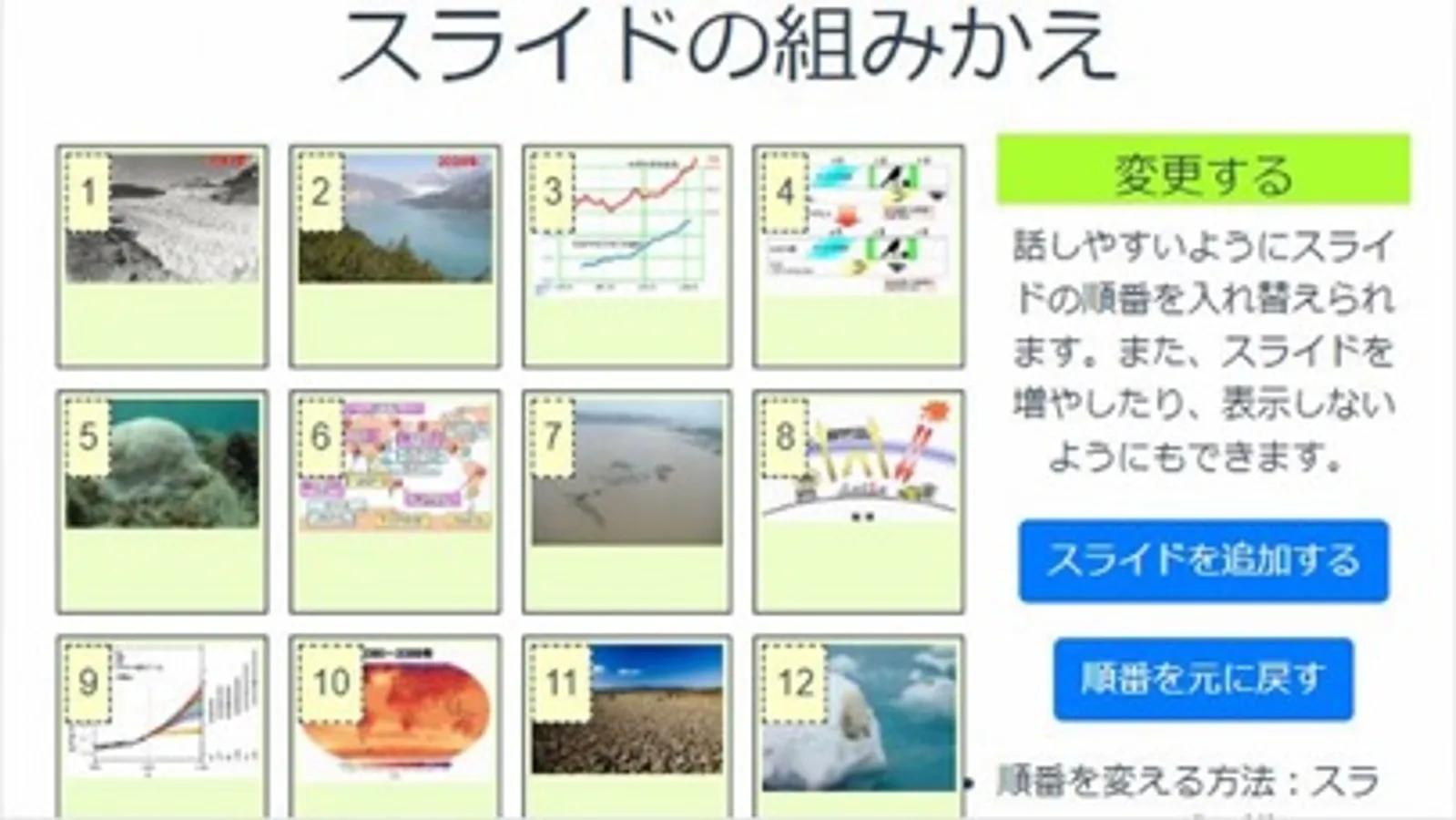 「地球温暖化とは」ではスライドショー形式で学べるほか、画像を追加して自分なりのスライドショーを作ることもできます。