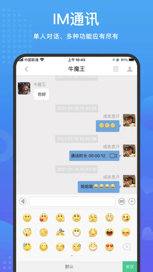 支持单人对话,以及群组聊天,人员、群组搜索。