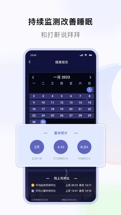 1、通过无感睡眠数据采集法,告别穿戴睡眠监测设备束缚感,每日记录监测你的入睡睡眠时间、打鼾情况、呼吸暂停次数时长、体动等多项数据。