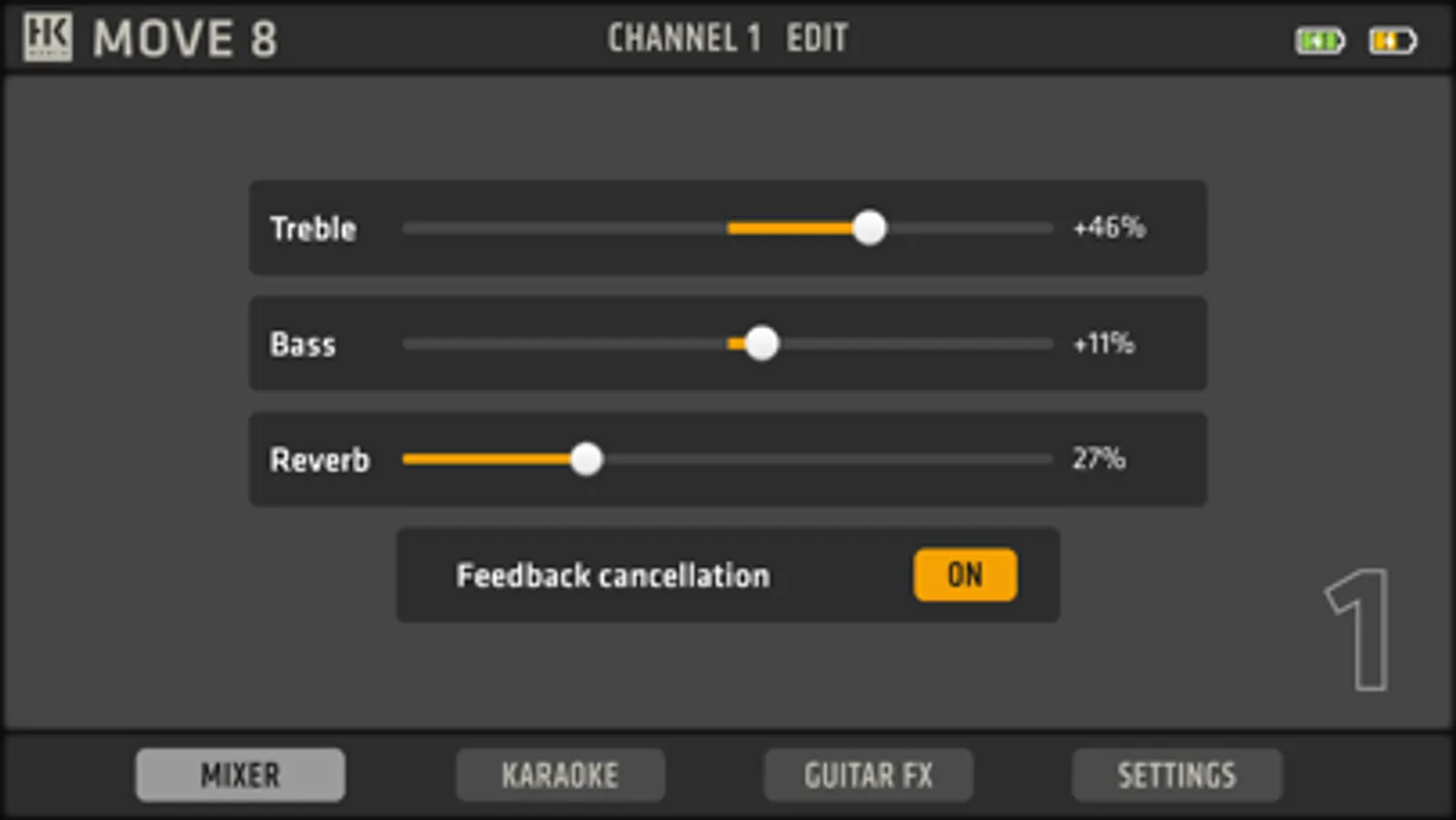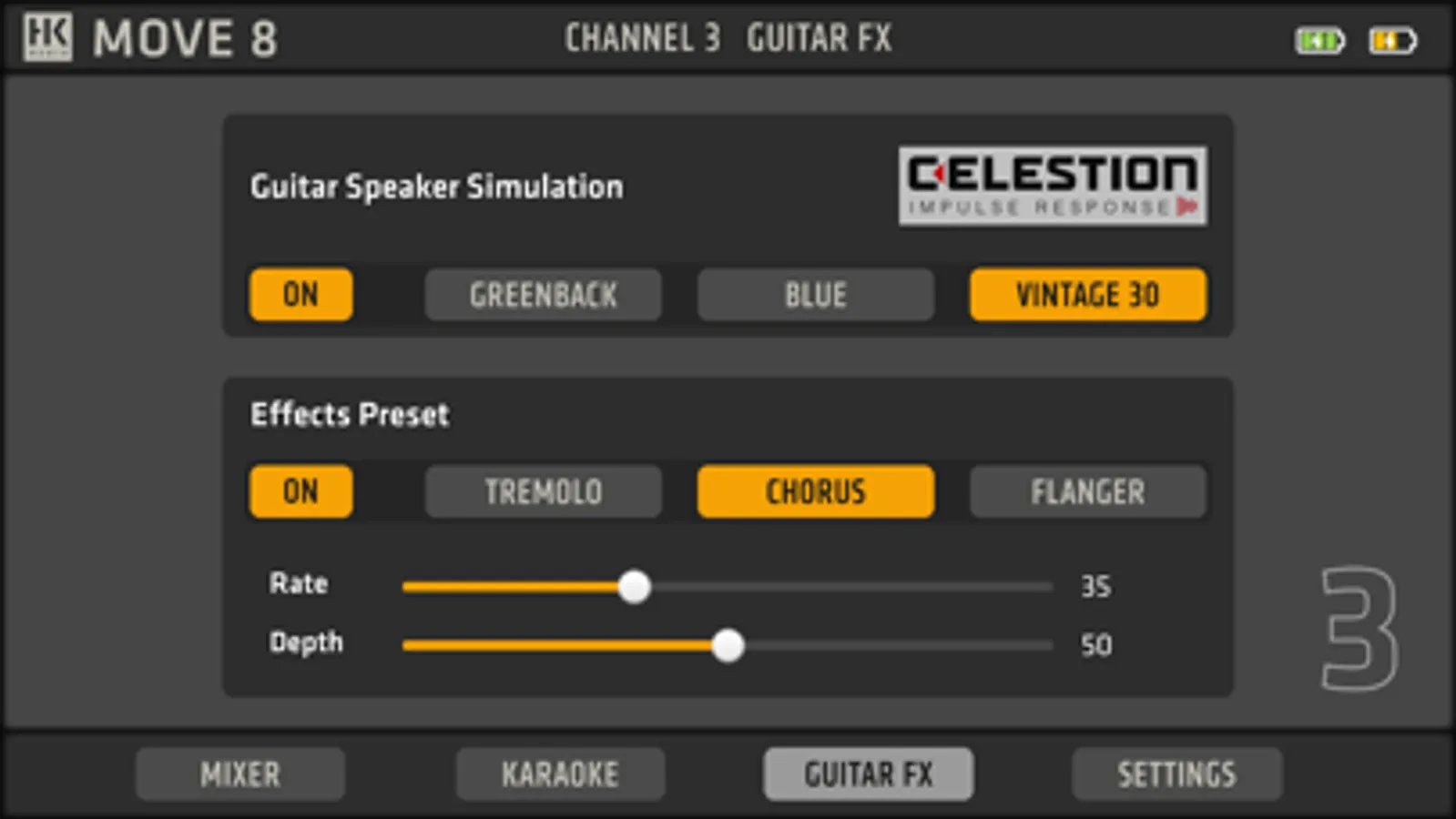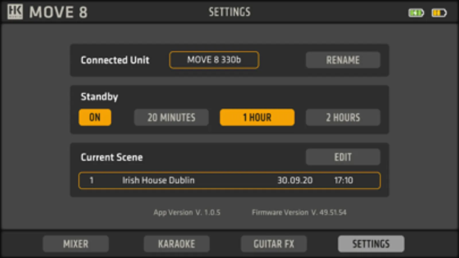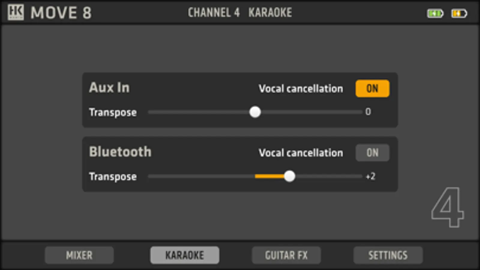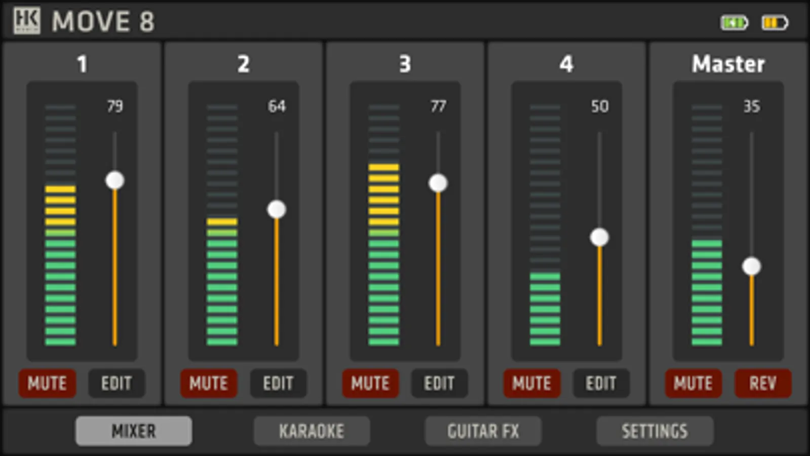 The MOVE 8 REMOTE app offers complete and convenient control of HK Audio´s PREMIUM PRO Move 8, a battery powered speaker with integrated 4-channel mixer and Bluetooth 5. But it is not just a remote control: it also adds some sophisticated features that make it even more fun. The App can be used to control all the channel settings (EQ, reverb, volume) as well as the master volume. In addition, a 2-band EQ is available for channel 4 (Aux/Bluetooth), and the karaoke function can be activated for Bluetooth audio streaming and Aux In including Vocal Cancellation and Transpose. The integrated effects (chorus, tremolo, and flange) as well as the 3 Celestion cab simulations can be selected on channel 3 and can be used to optimize the sound of an electric guitar and other instruments. All EQ settings can also be stored and quickly recalled.