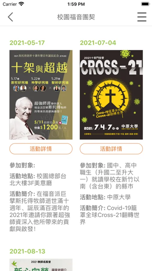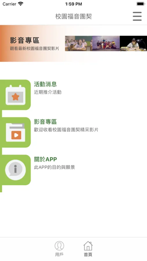 歡迎使用校園福音團契 App 。期待我們能透過 App ,與校園的學生、輔導、校園之友建立連結、經營關係。 此 App 提供校園的最新消息、活動資訊、影音資訊等... 會不定期更新內容