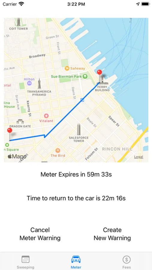 Not sure if you can get back to the car before your parking meter expires? The app uses Apple's walking directions to figure out how long it will take to return to the meter. It notifies you when you need to return to the car, with a little time to spare.