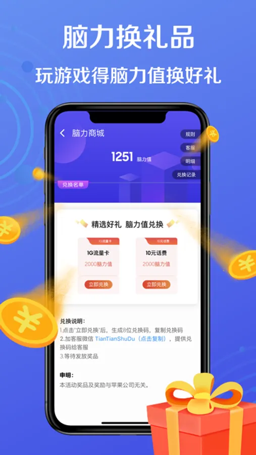 6)玩游戏得脑力值兑好礼,话费、流量等你来拿