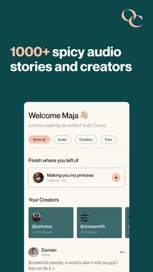Our platform is designed to help creators monetize their skills and connect with an engaged audience who appreciates their talent. And for users, our app offers a treasure trove of captivating stories and voices to help you find your inner calm and explore uncharted territories.