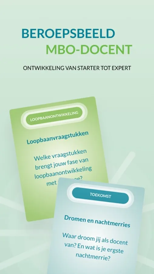 Deze dialoogapp heeft tot doel om docenten en docententeams te ondersteunen bij gesprekken over loopbaanontwikkeling. De app bevat 48 vragen die het startpunt kunnen zijn voor individuele reflectie over persoonlijke loopbaanontwikkeling en -ambitie, voor een ontwikkelgesprek met een leidinggevende, of voor een dialoog binnen het team over het gebruik van elkaars kwaliteiten.
