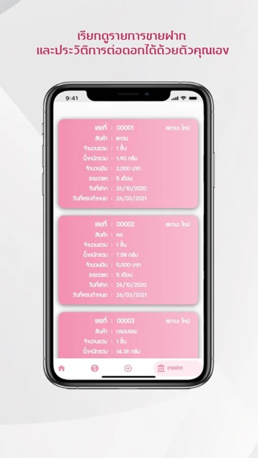 • ลดความยุ่งยาก สามารถดูความเคลื่อนไหวและประวัติ รายการขายฝาก, รายการซื้อสินค้า และออมทอง ได้ครบในแอพเดียว