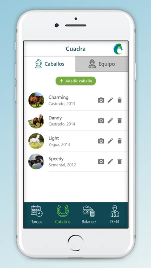 - Añadir tus caballos y tu equipo a la app. En la sección de los caballos tendrás: todos sus datos, sus ingresos y gastos, fotografías, vídeos y sus documentos importantes como exámenes veterinarios y pasaporte.