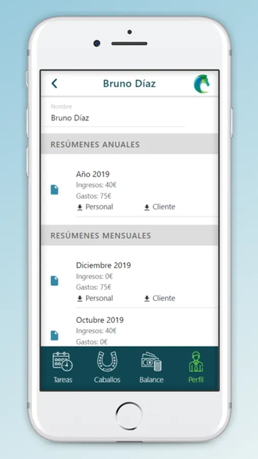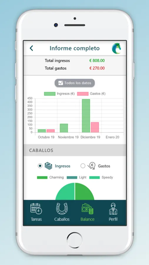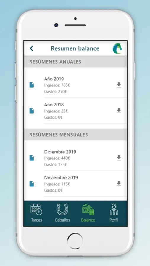 - Balance completo de ingresos y gastos. Podrás ver gráficamente los balances de todos los meses y por categorías, caballos y clientes. Además existe la posibilidad de descargar los resúmenes del balance tanto anual como mensual.