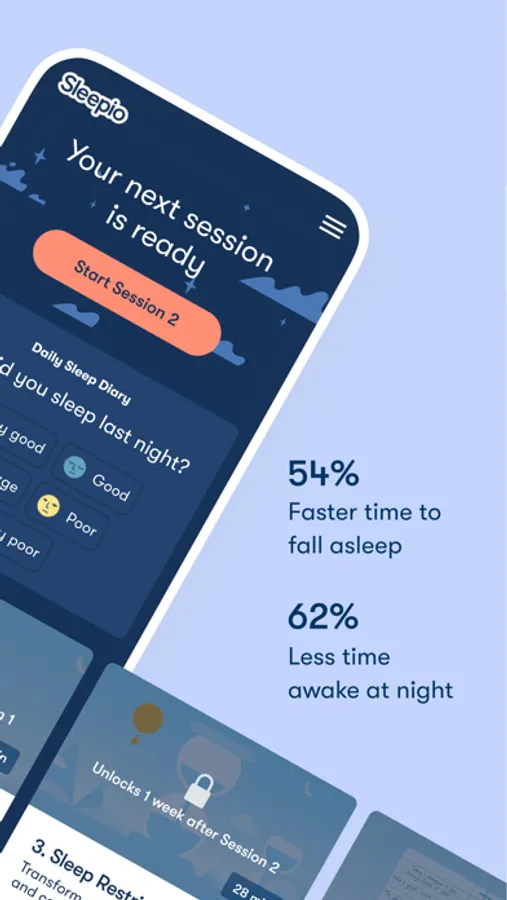 Sleepio isn’t a one-size-fits-all approach. It incorporates your unique needs to create a personalized six-week program that you complete at your own pace. Each session builds on the last, guiding you step-by-step through methods proven to help you quiet your racing mind, reshape your behaviors, and get better sleep — all in about 20 minutes per week.