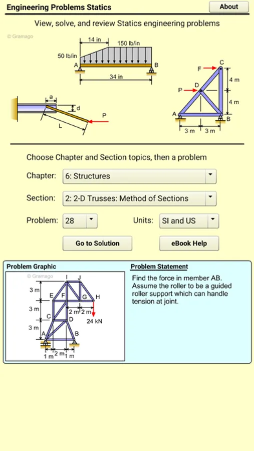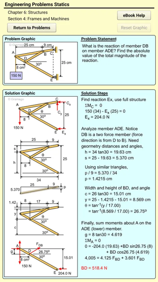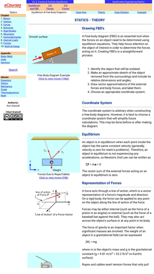 Eng Statics app provides real homework and test problems for the common engineering course called Statics. All problems are organized in sections and chapters common to most textbooks. Each problem has a complete solution with graphics to help you better understand how to solve the problem. Also, each problem has a link to a theory web page for that section at the online eBook (eCoursesBook.com). There is no cost for the online eBook, and it can be accessed outside of the app.