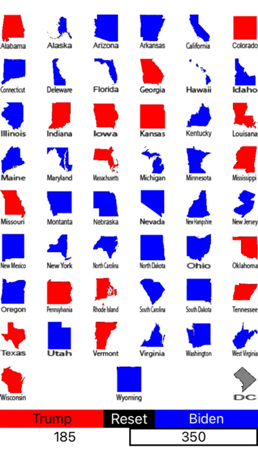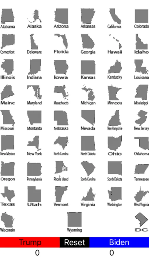 This electoral college score keeper will help you run through the various presidential election scenario's. All 50 states plus DC are included. The app includes a reset button and it declares winner as well.
