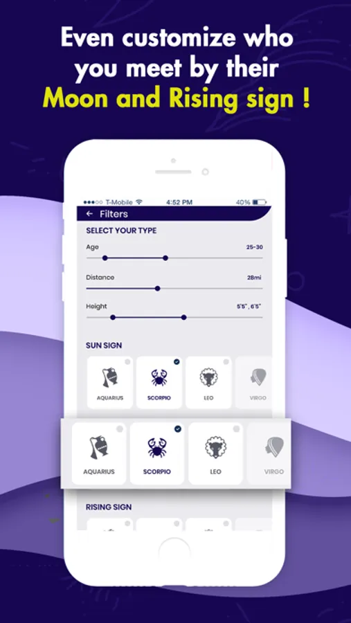 Have your own preferences in your zodiac dating search? Add filters before you perform the local dating search based on zodiac signs. Set preferred Age, Distance, Heigh, and Sun, Moon, and Rising horoscope signs. Get matches and start a dating chat by sending a message.