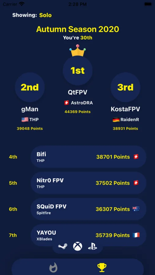 When opening the app, you'll see instantly where your tracked pilot (most likely yourself) is ranked. In the Leaderboards tab it's possible to filter for different platforms with the tap of a button