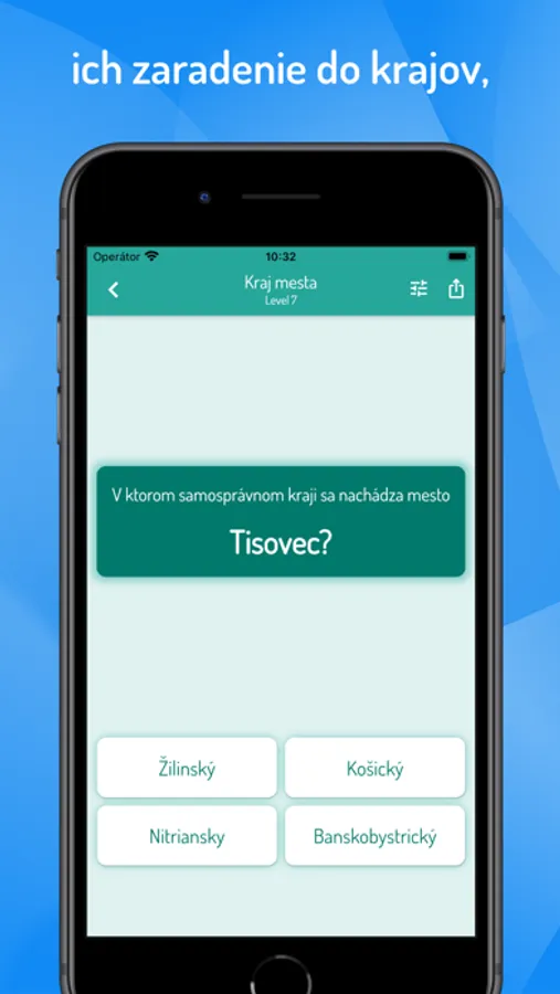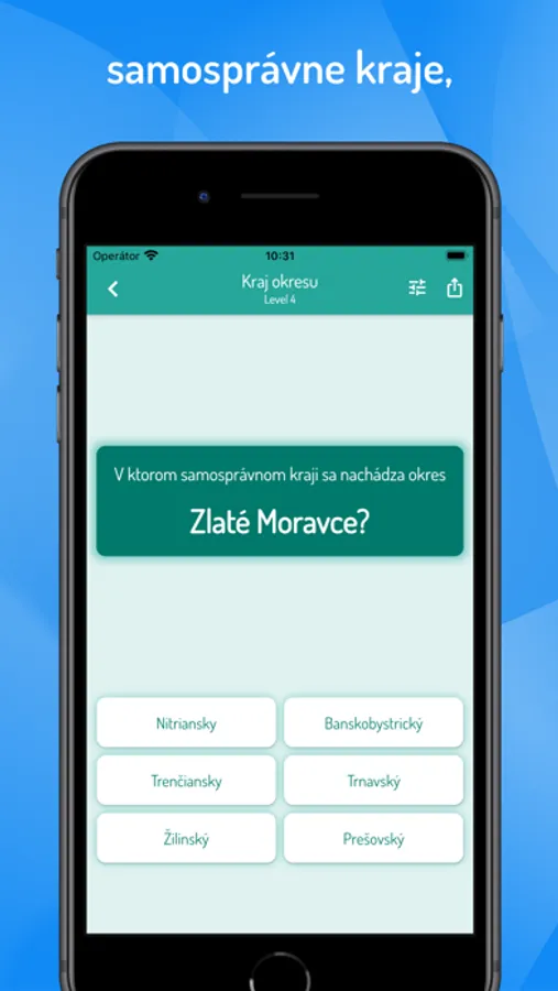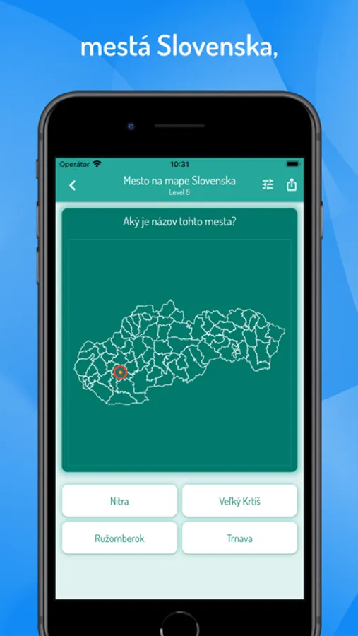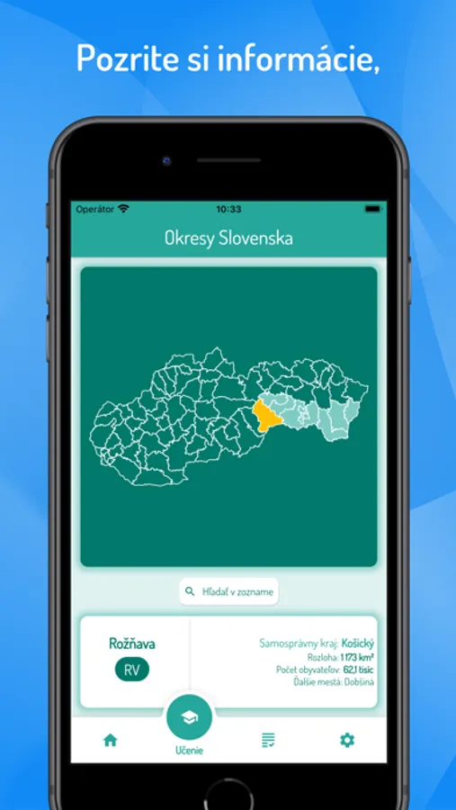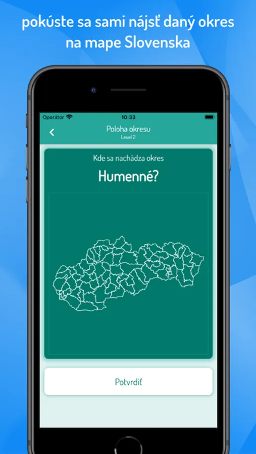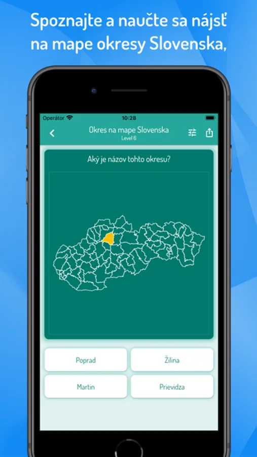 V tejto geografickej hre sa postupne naučíte názvy, značky a kraje všetkých slovenských okresov a zároveň ich budete vedieť nájsť na mape Slovenska. Kvíz vás tiež naučí, ako nájsť na mape najväčšie slovenské mestá a identifikovať ich okresy a kraje, resp. vyššie územné celky.