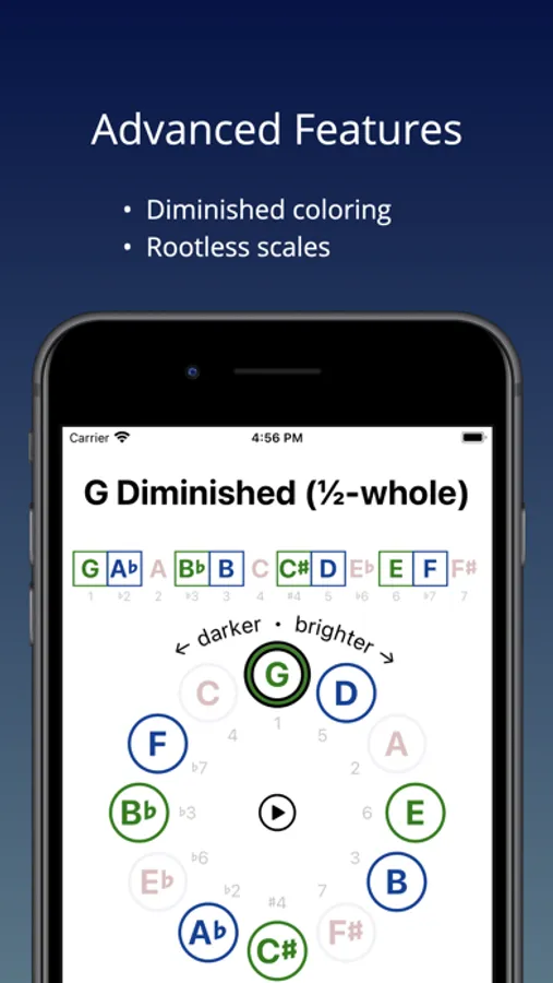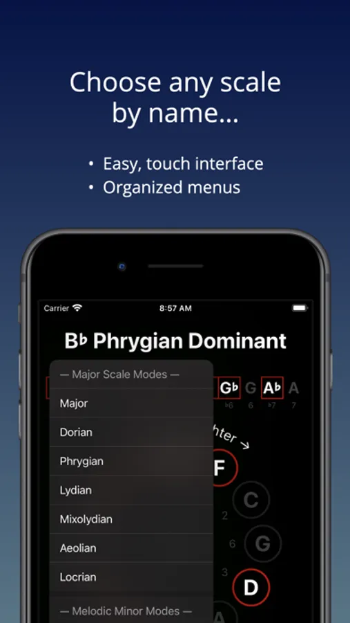 ScaleMate shows every scale both linearly (for melodic understanding) and on the circle of fifths (for harmonic understanding).