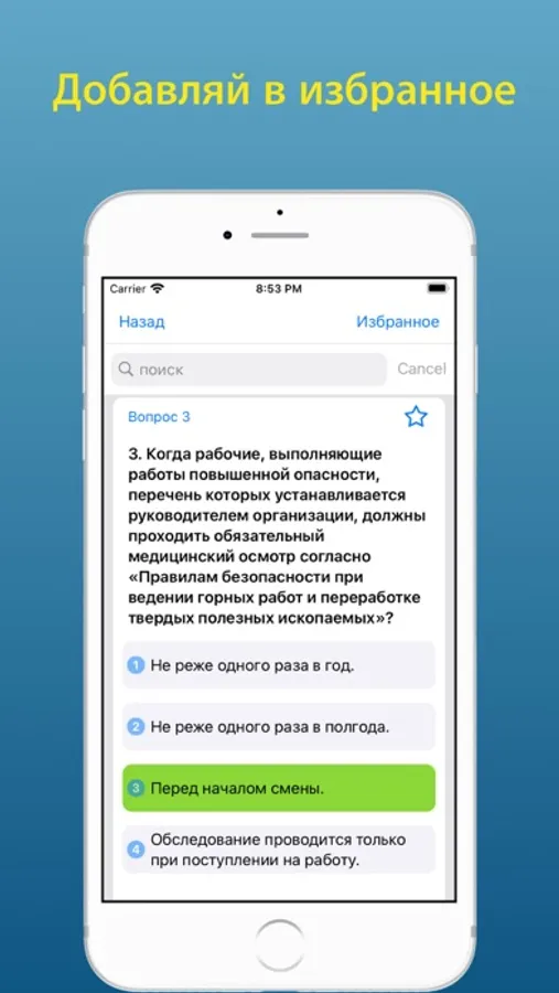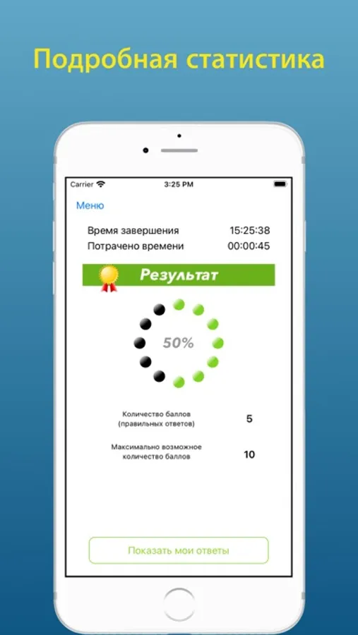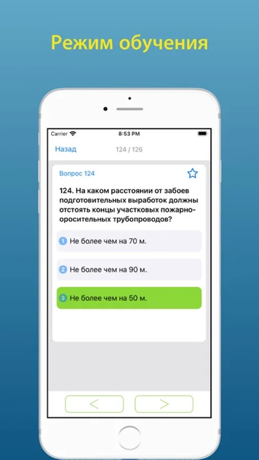 • Подготовка - Позволяет изучить вопросы в текстовом формате с отмеченными правильными ответами;