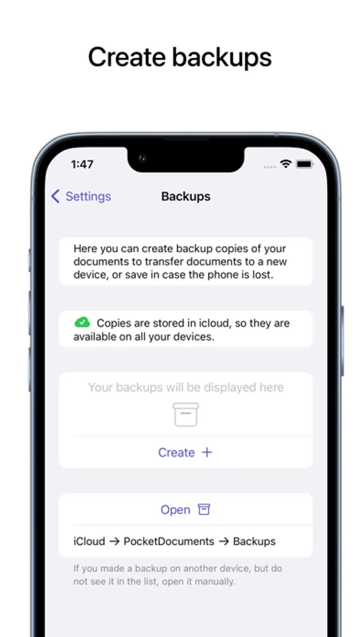 We don't use servers to store data, your documents are stored only on your device. For extra security, you can set a password and use TouchId or FaceId to quickly unlock.