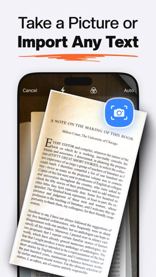 - Scan physical book pages with your device camera, enabling Speechy to convert them into accessible audio content. This feature is particularly useful for those who prefer physical books or need assistance with reading.