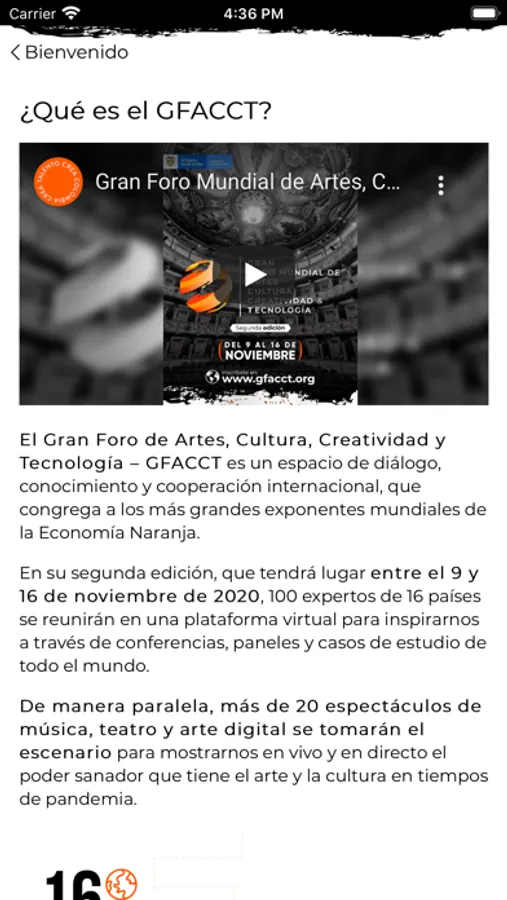 El Gran Foro Mundial de Artes y la Cultura, Creatividad & Tecnología (GFACCT 2020) es un espacio gratuito que busca generar consciencia sobre la relevancia de la economía creativa como pilar del desarrollo sostenible para diferentes sectores de la economía, el emprendimiento y el desarrollo; la tecnología, la creatividad, la cultura y las artes en Colombia; a través del intercambio de conocimientos y experiencias.